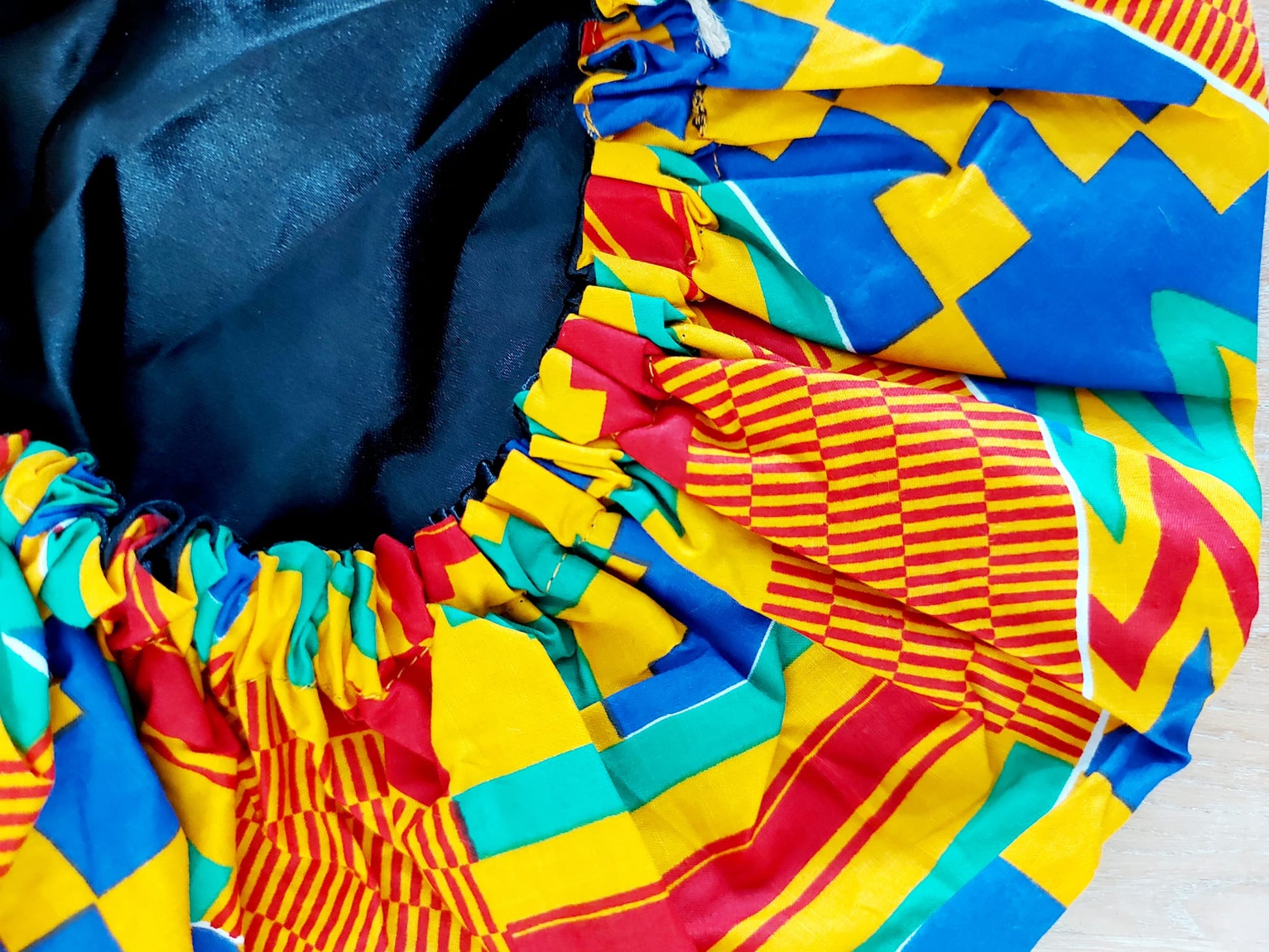 The bonnet is made with 100% Cotton African Mudcloth inspired print fabric on the outside and 100% satin on the inside. The satin helps to protect your natural hair moisture and prevents your hair from getting dry and brittle as a result of friction from the pillowcase.