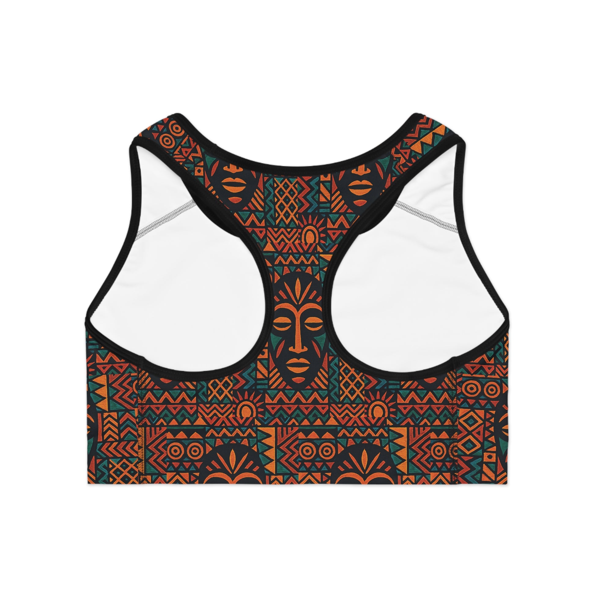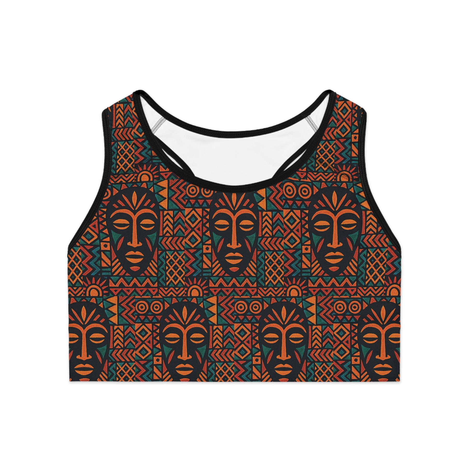 Introducing our most powerful active top—a stunning tribute to traditional African ceremonial masks. The dense, intricate pattern features a captivating mix of rust, terracotta, and deep teal against a rich charcoal backdrop, creating an unparalleled depth that transforms workout gear into wearable art.