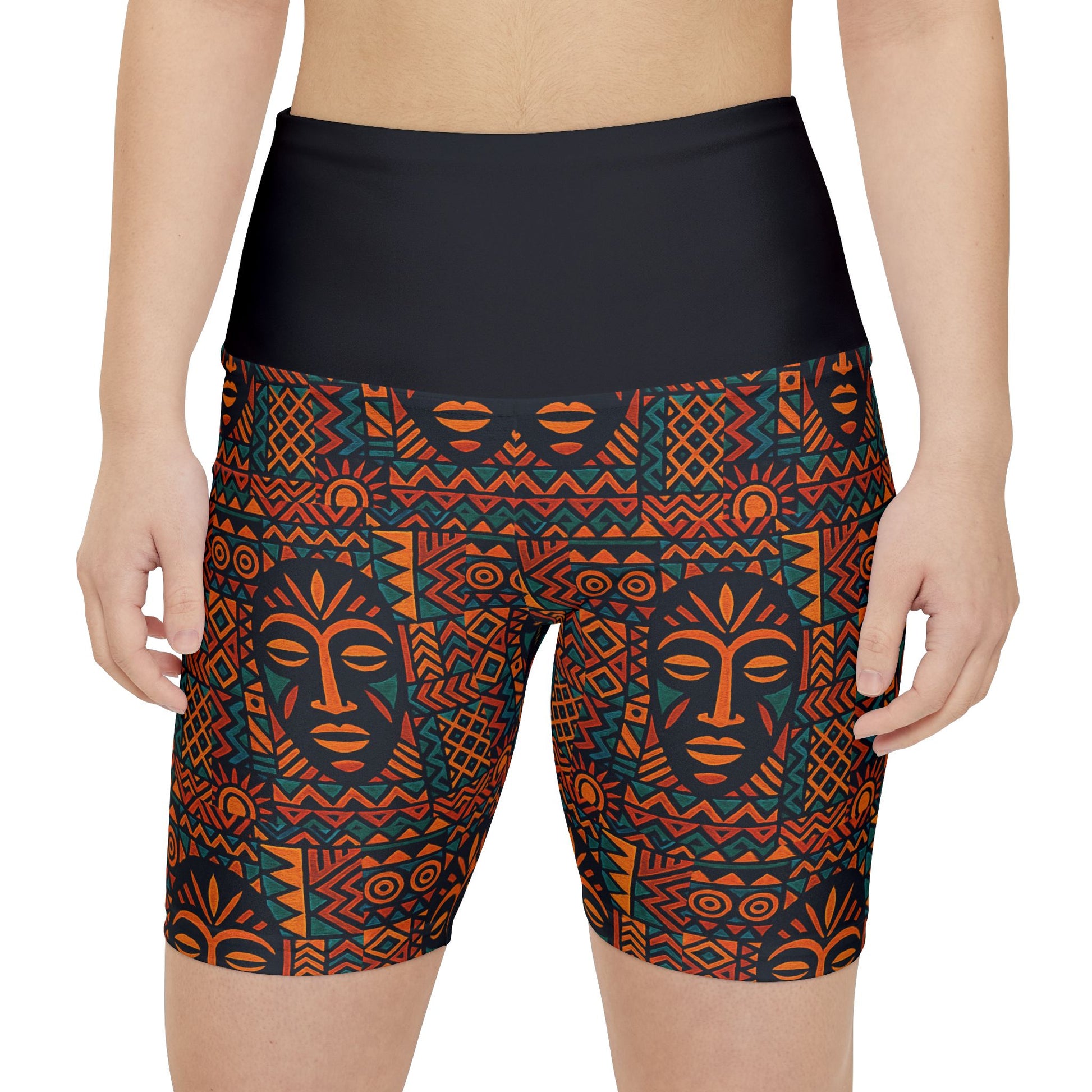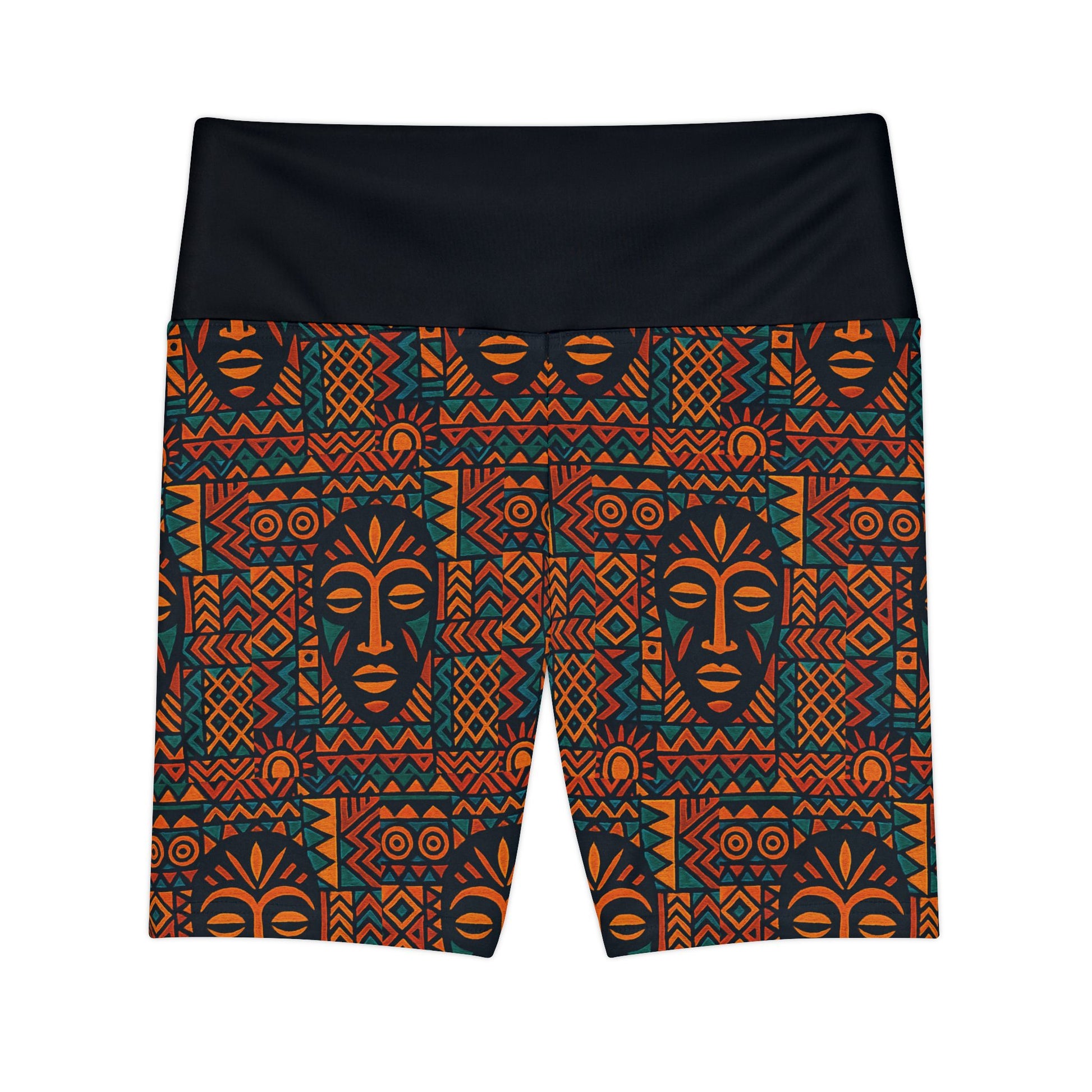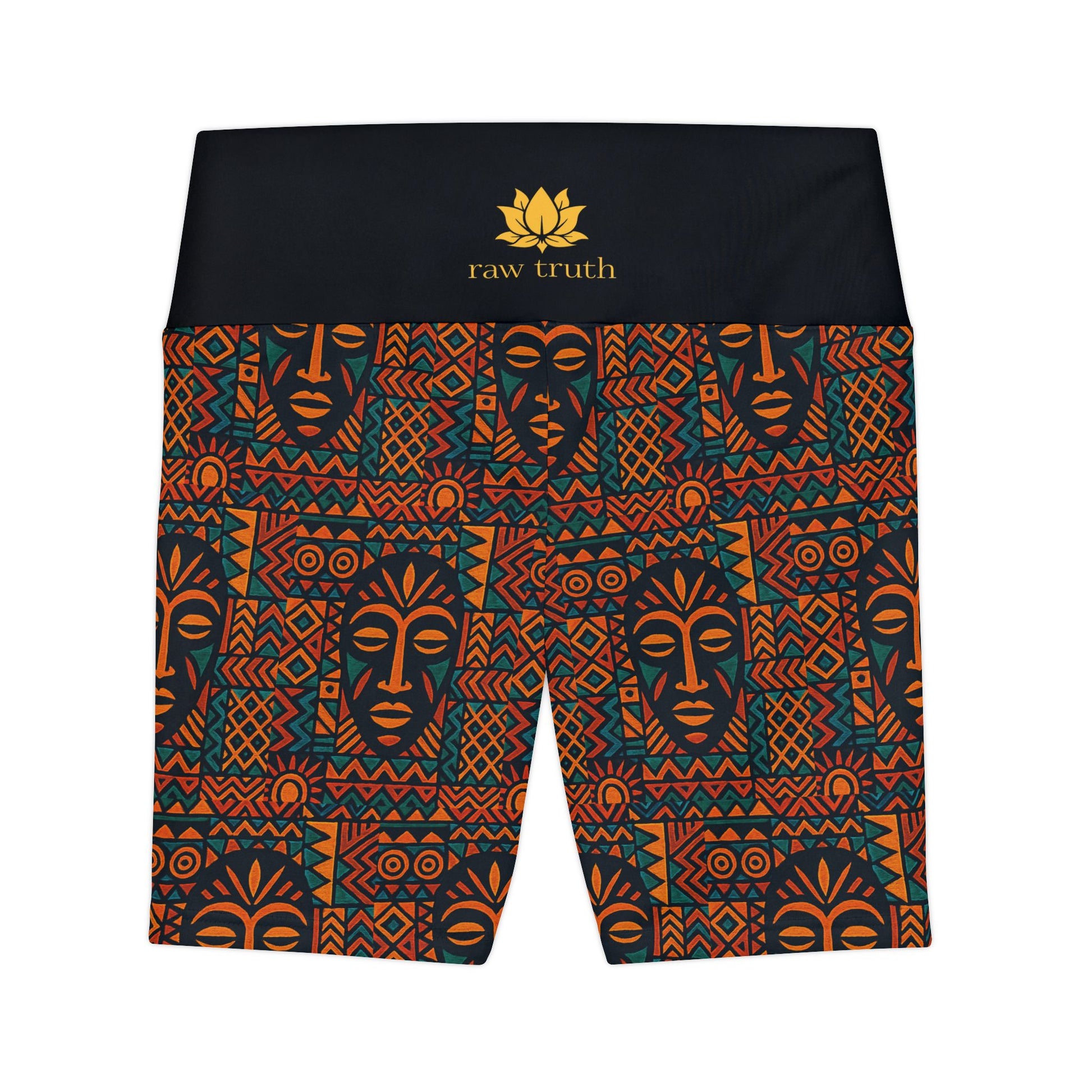 Step into your strength with the RAW TRUTH High-Waist Bike Shorts, showcasing our most captivating Legacy Mask Print. This vibrant design is a powerful homage to traditional African ceremonial masks, presented in a striking palette of rich rust, warm terracotta, and deep teal against a charcoal background. These shorts are designed not just for performance, but to make a statement.